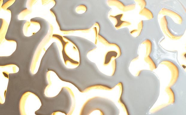 « Soudain la boule de faience s’anime offrant sa clarté en miriades d’étoiles, dans un tourbillon d’ombre et de lumière. » Matériaux utilisés : Terre blanche, cuisson faïence. Dimensions : Ø 35 cm Fourni avec système électrique dissocié de la boule (afin de mettre une bougie si besoin)....